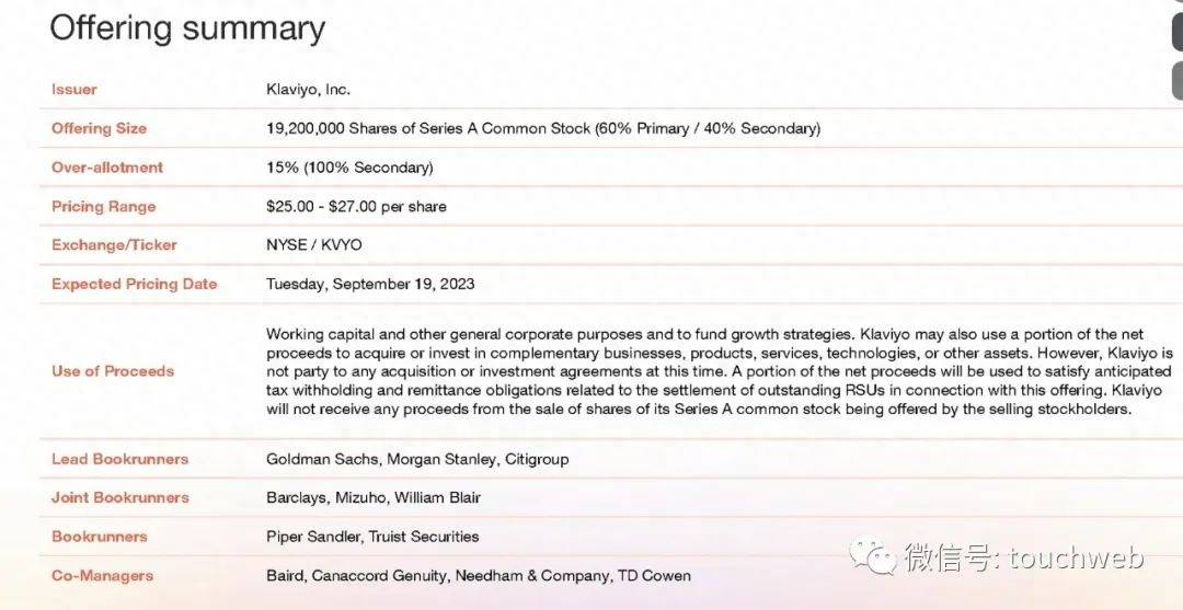 Klaviyo发行区间为25美元到27美元,一共发行1920万股,最高募资5.18亿美元,寻求估值高达84亿美元。