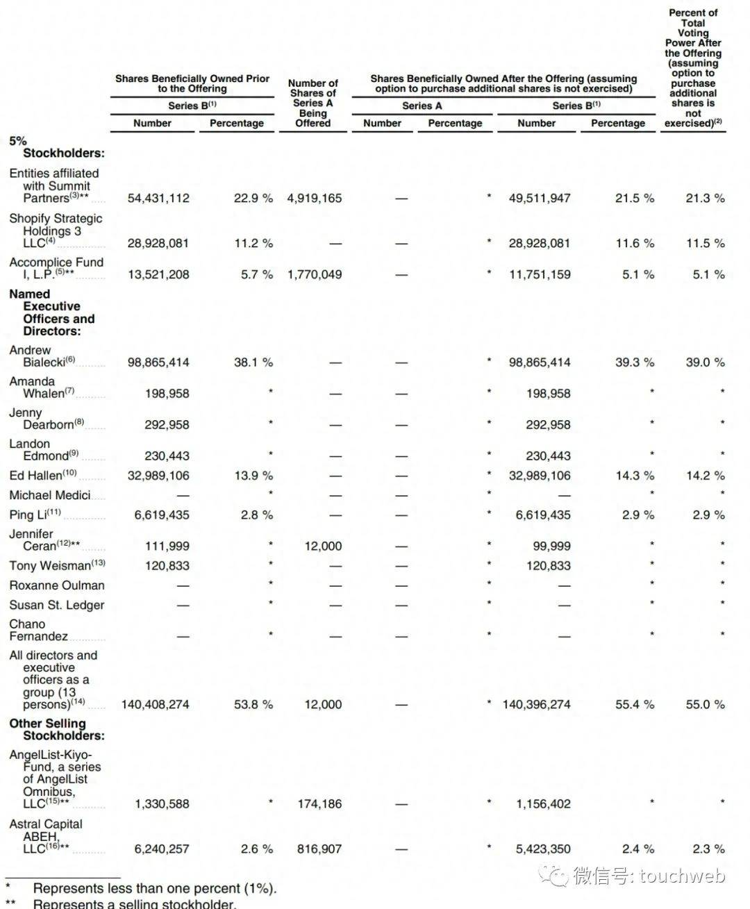 IPO后,Smmit Partners持股21.5%,有21.3%投票权;Shopify持股11.6%,有11.5%投票权,Accomplice Fund I持股5.1%,有5.1%投票权,Andrew Bialecki持股为39.3%,有39%的投票权;