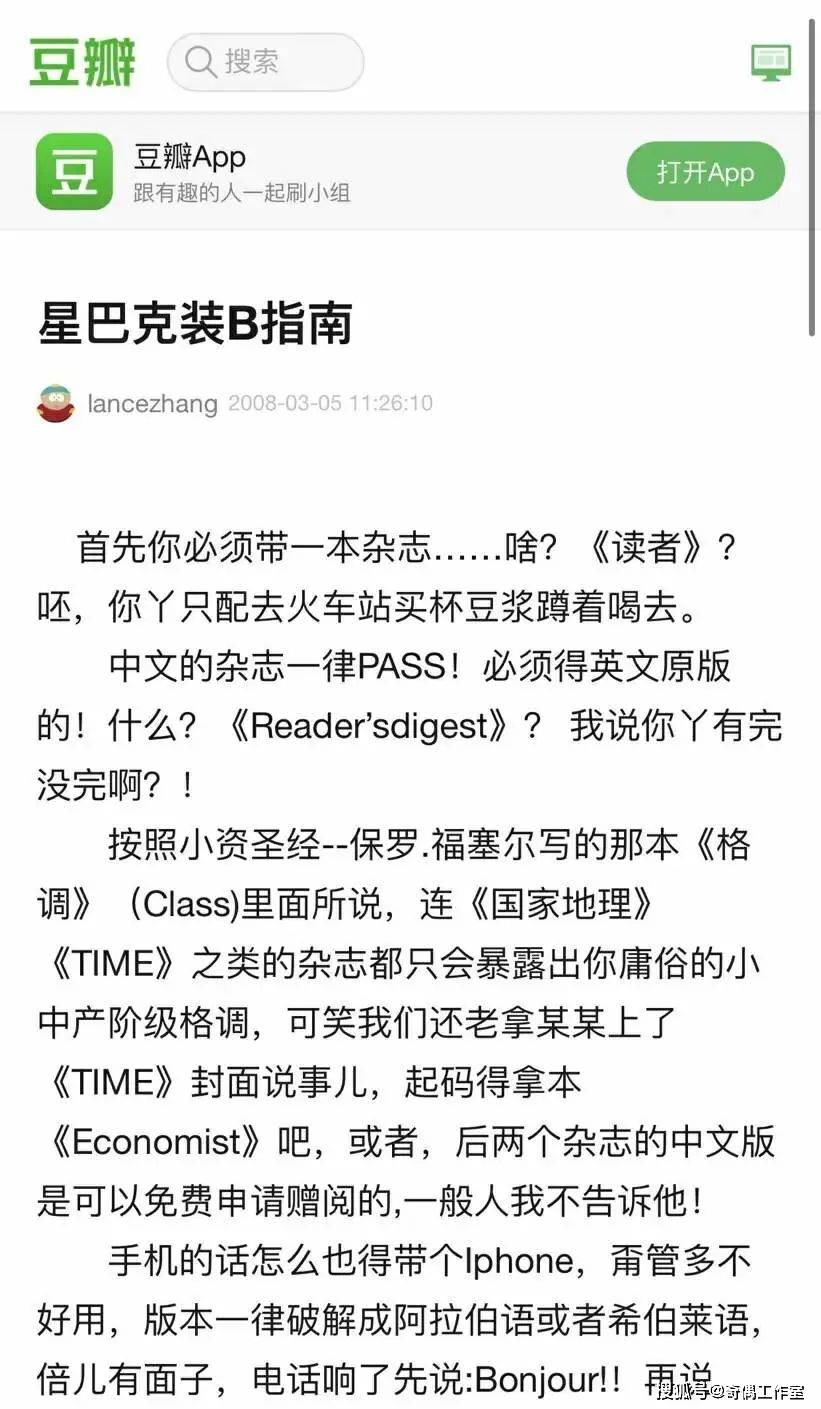 但事实就是事实,不仅大鹏在成名作《屌丝青年》里留下了模仿小资青年喝星巴克用iPad的镜头,而且08年就有《星巴克装X指南》这样的神帖从豆瓣火到整个简中网络。