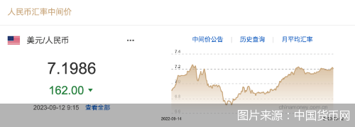 北京商报讯(记者 廖蒙)9月12日,人民银行授权中国外汇交易中心公布,2023年9月12日银行间外汇市场人民币汇率中间价为:1美元对人民币7.1986元,前一交易日中间价报7.2148元,单日调升162基点。人民币中间价连续两个交易日升值。