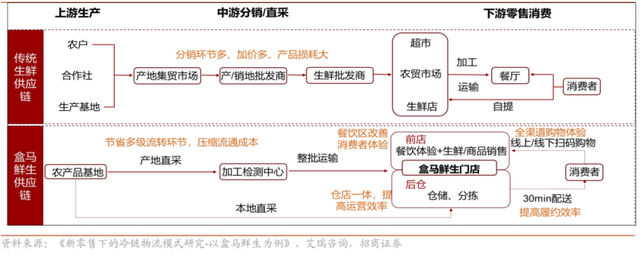 盒马之所以能够给用户提供线上、线下都近乎完美的购物体验,背后少不了在供应链各环节上的深耕。对比传统生鲜供应链体系,盒马采用产地直采以及仓店一体等手段减少了链路环节,降低流转成本进而实现运营效率有效提升。