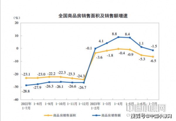 2023 年 1—7 月份,商品房销售面积 66563 万平方米,同比下降 6.5%。商品房销售额70450 亿元,下降 1.5%。