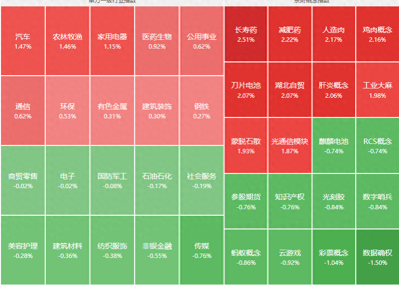 分行业来看,汽车、农林牧渔、家用电器、医药生物、公用事业等行业领涨,传媒、非银金融、纺织服饰、建筑材料、美容护理等行业领跌。