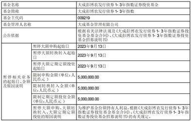 自2023年9月13日起,单个账户累计申购(含定期定额申购)和转换转入大成彭博农发行债券1-3年指数证券投资基金的累计金额(含该账户存量份额市值)应不超过500万元(含本数)。如果单个账户累计申购(含定期定额申购)和转换转入大成彭博农发行债券1-3年指数证券投资基金的累计金额(含该账户存量份额市值)超过500万元(不含本数),本公司将有权对当日部分或全部申请予以拒绝。