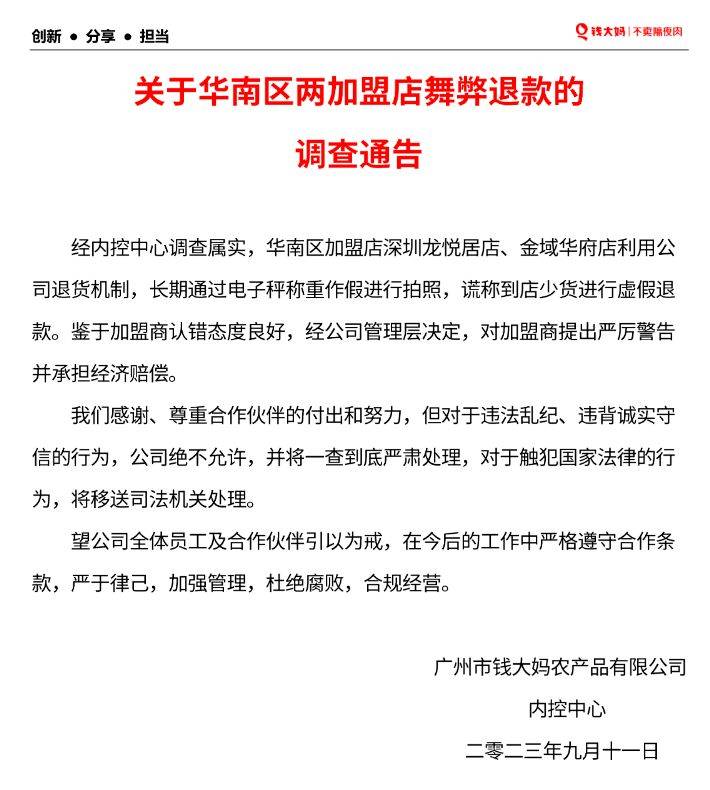 【钱大妈:华南区两加盟店舞弊退款,公司对其提出严厉警告】9月11日,钱大妈发布关于华南区两加盟店舞弊退款的调查通告:经内控中心调查属实,华南区加盟店深圳龙悦居店、金域华府店利用公司退货机制,长期通过电子秤称重作假进行拍照,谎称到店少货进行虚假退款。鉴于加盟商认错态度良好,经公司管理层决定,对加盟商提出严厉警告并承担经济赔偿。(界面新闻)