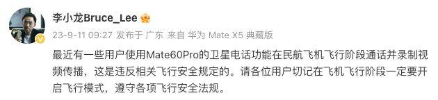 【华为高管李小龙提醒用户规范使用Mate 60 Pro卫星电话功能】9月11日,华为终端BG CTO李小龙发布微博,提醒华为用户规范使用Mate 60 Pro的卫星电话功能。李小龙称,“最近有一些用户使用Mate60Pro的卫星电话功能在民航飞机飞行阶段通话并录制视频传播,这是违反相关飞行安全规定的。请各位用户切记在飞机飞行阶段一定要开启飞行模式,遵守各项飞行安全法规。”(每日经济新闻)