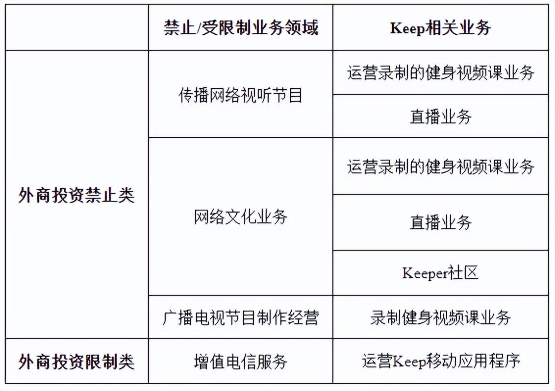 根据《外商投资准入特别管理措施(负面清单)(2021年版)》(“负面清单”)的规定,外国投资者禁止持有从事网络视听节目服务、广播电视节目制作与经营业务以及互联网文化经营(音乐活动除外)的企业股权,另外,外国投资者持有需要「ICP许可证」开展业务的企业的股权不得超过50%。根据Keep招股书的合约安排章节披露,Keep开展及计划开展的相关业务的外商投资准入情况如下: