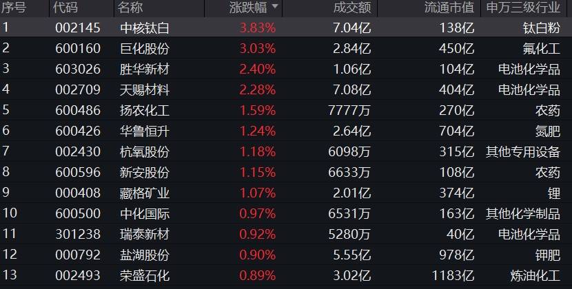 超半数成份股飘红,中核钛白、巨化股份涨逾3%,胜华新材、天赐材料涨逾2%,扬农化工、华鲁恒升、杭氧股份、新安股份等股涨逾1%,盐湖股份、荣盛石化等权重亦飘红。