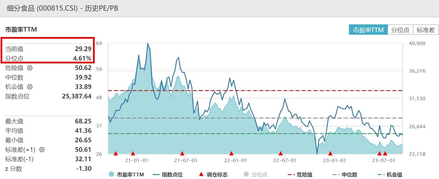 4、吃喝板块当前估值跌至近三年底部区间。从估值来看,年初以来吃喝板块整体震荡下行,估值也在调整中跌至低位,Wind数据显示,中证细分食品饮料产业主题指数最新PE-TTM29.29倍,处于近三年4.61%分位点,即低于近三年来逾95%时间区间,配置性价比显著。
