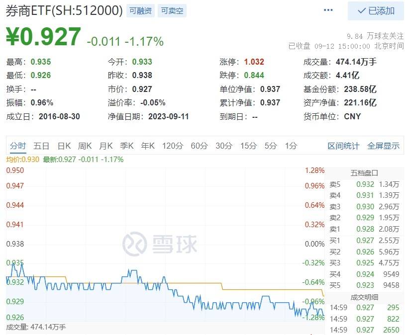 大金融全天弱势,券商股集体飘绿,券商ETF(512000)低开低走,午后随大市进一步下行,场内价格收跌1.17%,成交额4.41亿元,较上一交易日缩量51%。