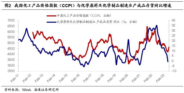 另据海通证券此前数据分析,化工产品价格指数通常领先于库存周期变动,由于企业通常根据产品价格以及盈利变化调整生产节奏,从而使得库存周期波动相较于产品价格存在一定滞后。前两次化工产品价格见底后(2016年1月、2020年4月),化学原料及化学制品产成品库存同比增速滞后6-12个月企稳回升。