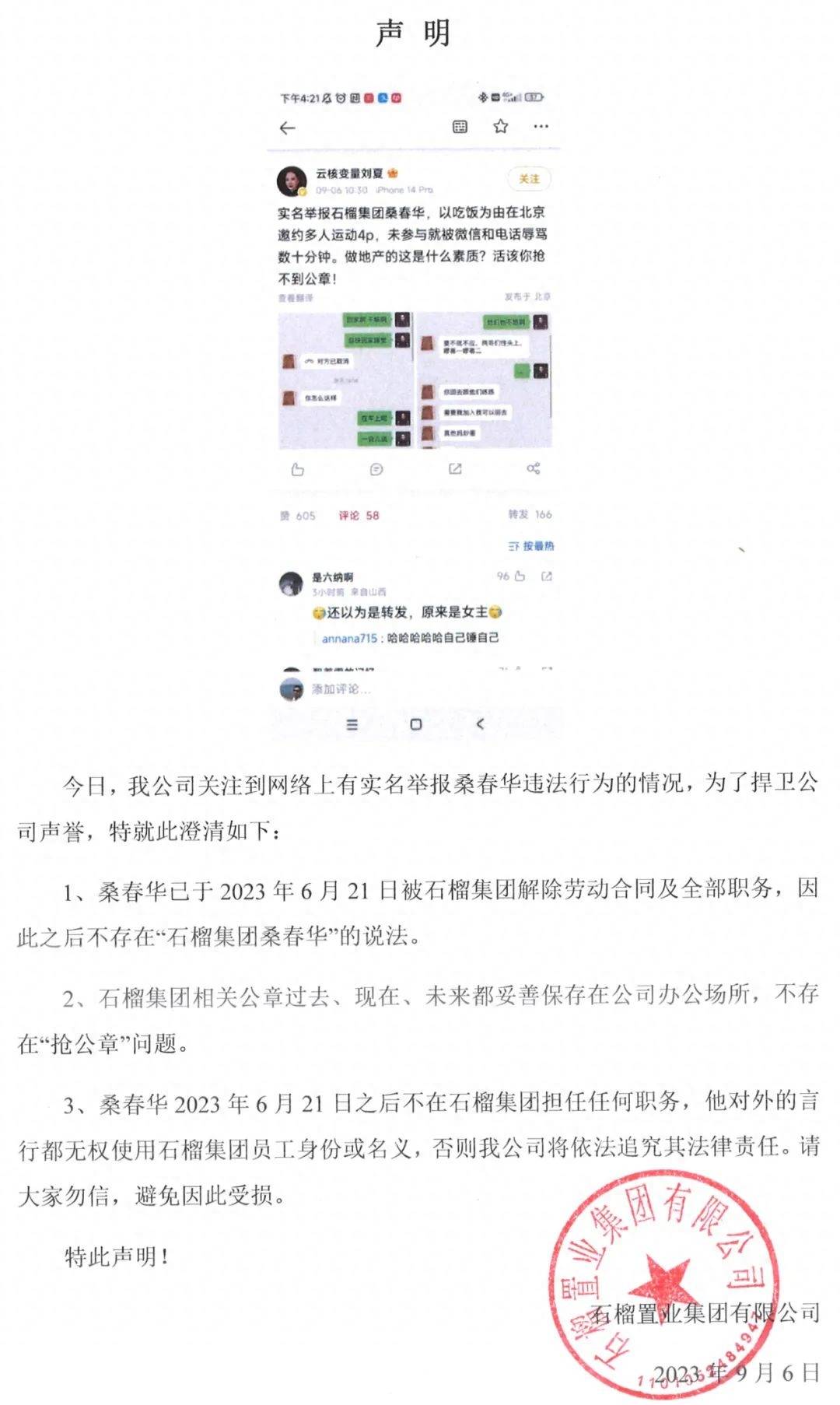 当晚,石榴集团在官微发布声明,表示桑春华已于2023年6月21日被石榴集团解除劳动合同及全部职务,因此之后不存在“石榴集团桑春华”的说法。石榴集团相关公章过去、现在、未来都妥善保存在公司办公场所,不存在“抢公章”问题。
