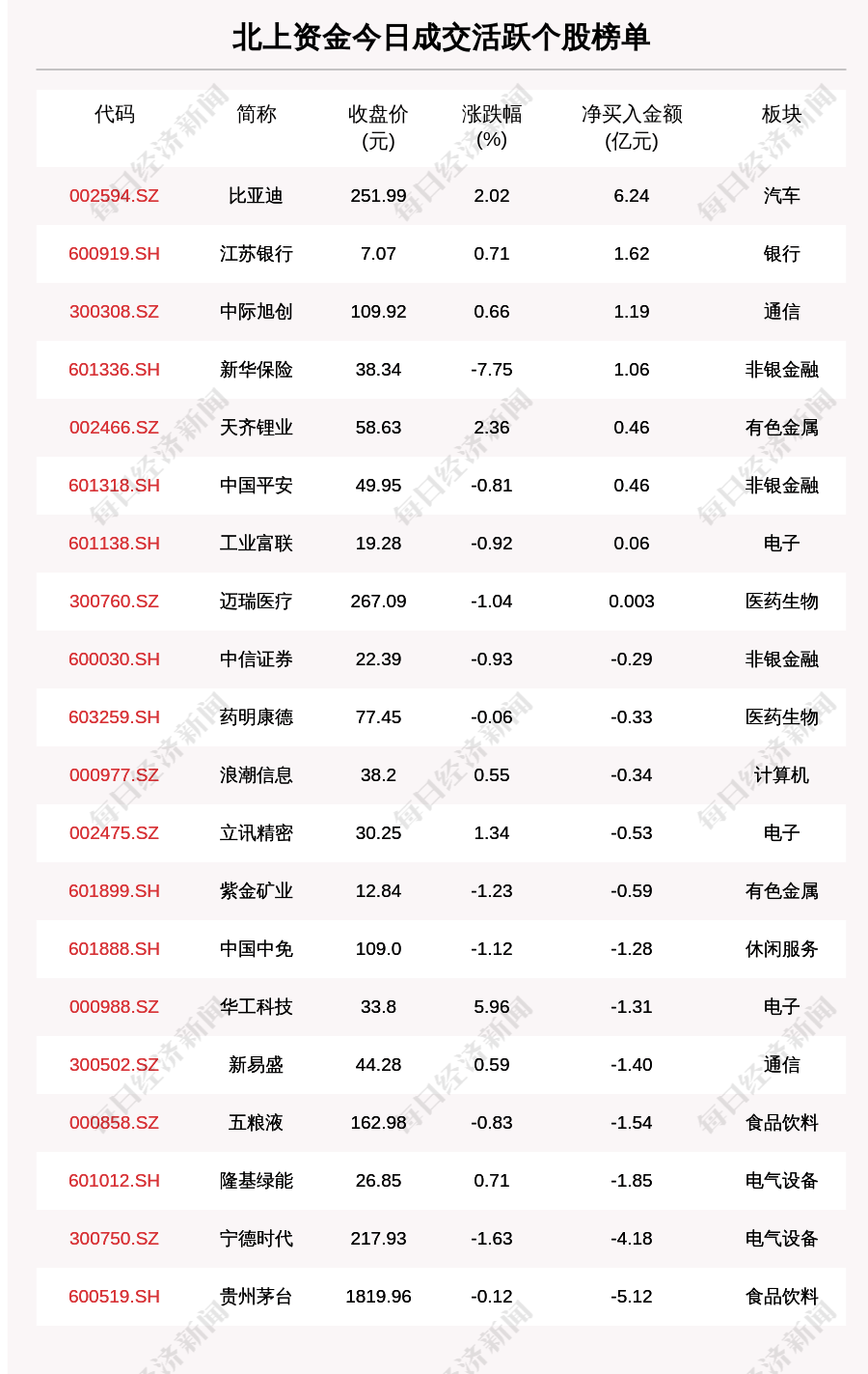9月12日,北上资金成交活跃个股榜单中,净买入个股共8只,金额最多的是比亚迪(002594.SZ,收盘价:251.99元),净买入6.237亿元;净卖出个股共12只,金额最多的是贵州茅台(600519.SH,收盘价:1819.96元),净卖出5.120亿元。