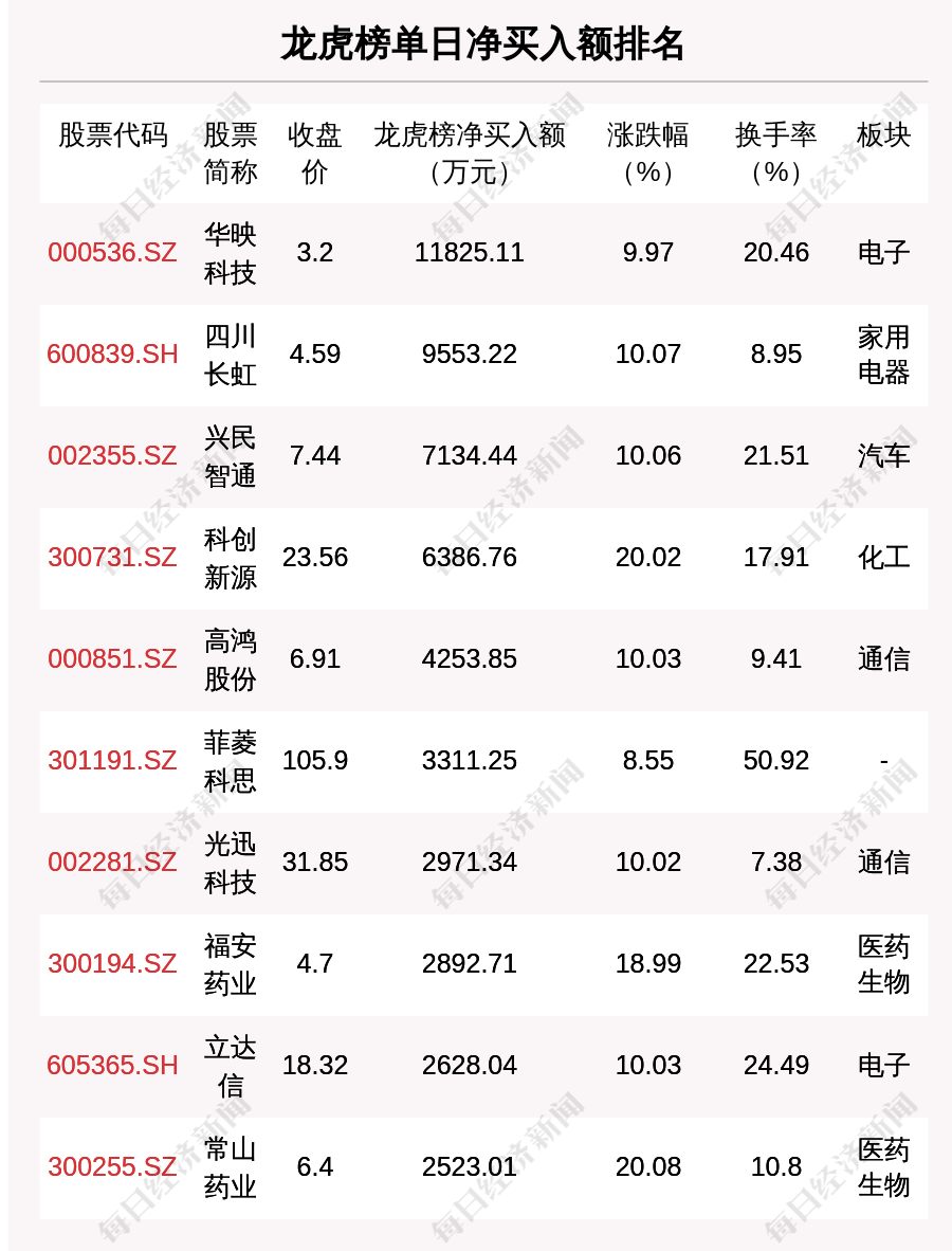 在龙虎榜中,涉及机构专用席位的个股有17只,净买入额前三的是华映科技、菲菱科思、铭普光磁,分别为7221.95万元、4643.14万元、2913.4万元。