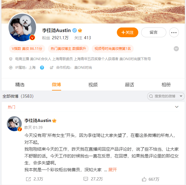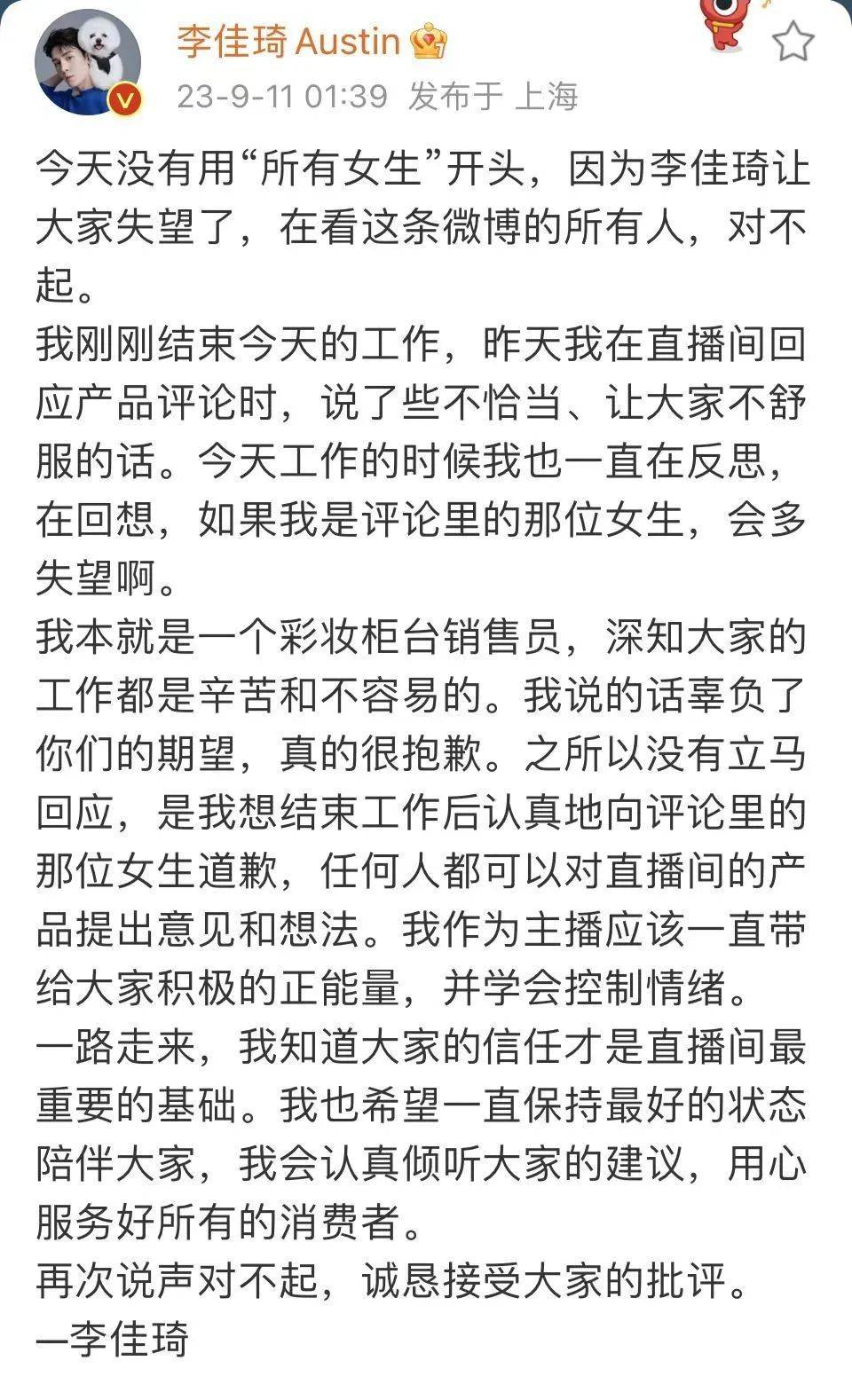 当日下播的凌晨时间,李佳琦在微博发文道歉。