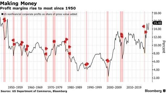 美国商务部去年8月公布的数据显示,税后利润占非金融企业总增加值的比例从去年第一季度的14%升至第二季度的15.5%,为1950年以来的最高水平。税后利润占总增加值的比例是衡量总利润率的一个指标。