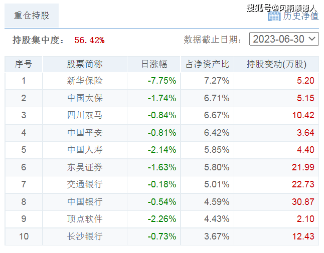 该基金的十大持仓中新华保险跌幅较大,其它个股还是以跌为主,前十大持仓占总持仓56.42%,持仓风格偏向金融行业,基金净值相对跑输市场(属于银证保行业的主动型混合基金) 【基金规模0.17亿元】。