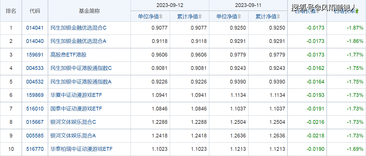 12日开放式基金净值增长排名后10的基金分别是:民生加银金融优选混合C、民生加银金融优选混合A、高股息ETF港股、民生加银中证港股通指数C、民生加银中证港股通指数A、华夏中证动漫游戏ETF、国泰中证动漫游戏ETF、银河文体娱乐混合C、银河文体娱乐混合A、华泰柏瑞中证动漫游戏ETF。