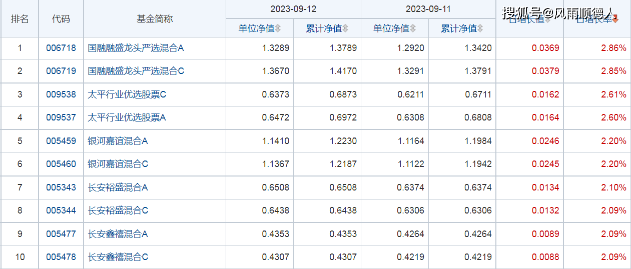 12日开放式基金净值增长排名前10的基金分别是:国融融盛龙头严选混合A、国融融盛龙头严选混合C、太平行业优选股票C、太平行业优选股票A、银河嘉谊混合A、银河嘉谊混合C、长安裕盛混合A、长安裕盛混合C、长安鑫禧混合A、长安鑫禧混合C。