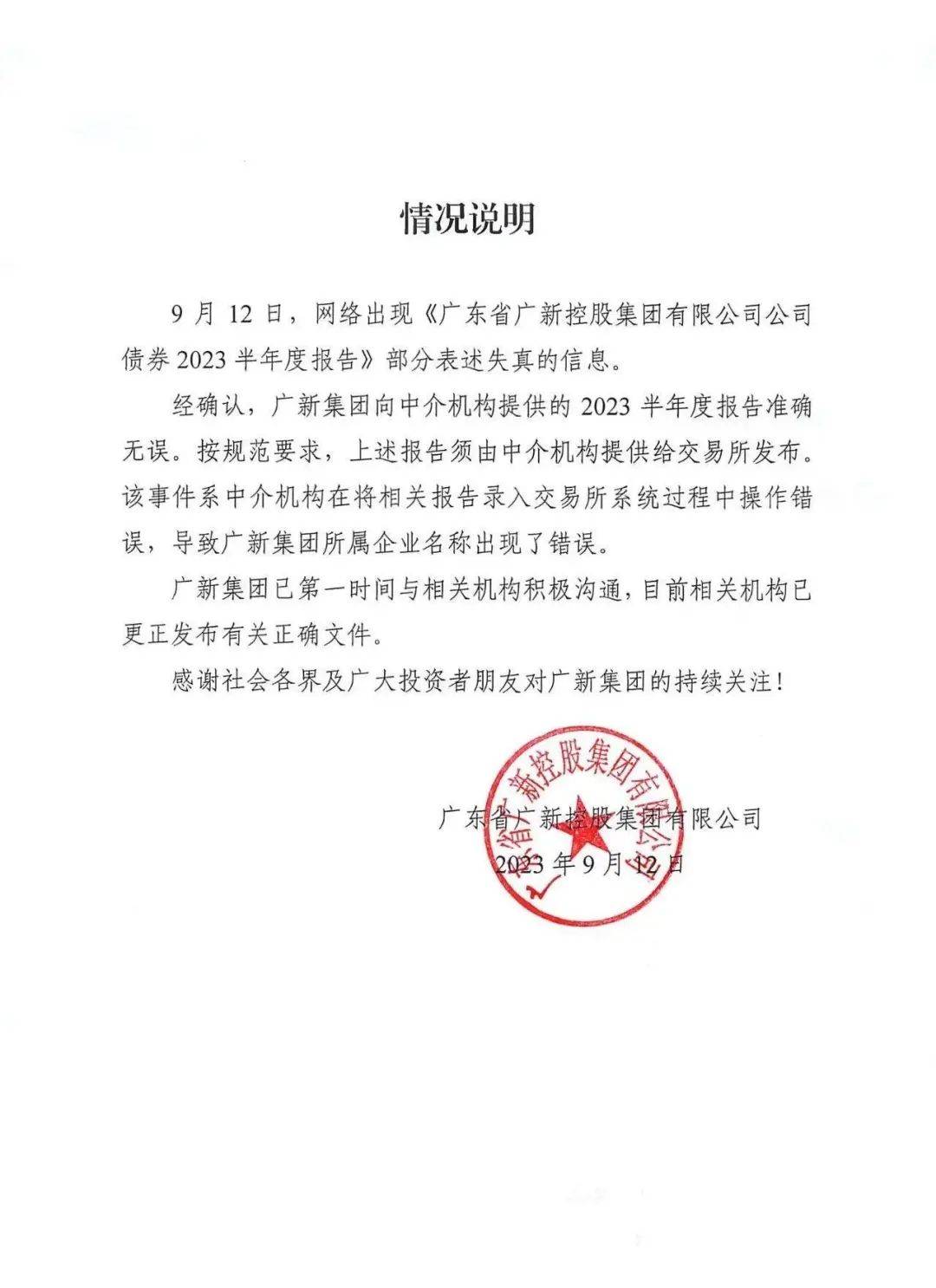 9月12日晚,广东省广新控股集团有限公司(下称“广新集团”)发布《情况说明》,对此前网络关注的广新集团公司债券2023半年度报告中表述失真的信息予以回应。