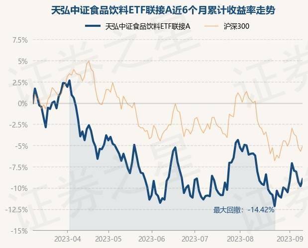 9月12日,天弘中证食品饮料ETF联接A最新单位净值为2.639元,累计净值为2.7171元,较前一交易日下跌0.21%。历史数据显示该基金近1个月下跌1.16%,近3个月上涨0.04%,近6个月下跌9.13%,近1年下跌4.56%。该基金近6个月的累计收益率走势如下图:
