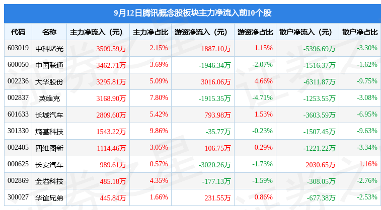 从资金流向上来看,当日腾讯概念股板块主力资金净流出9.89亿元,游资资金净流入1418.35万元,散户资金净流入9.75亿元。腾讯概念股板块个股资金流向见下表: