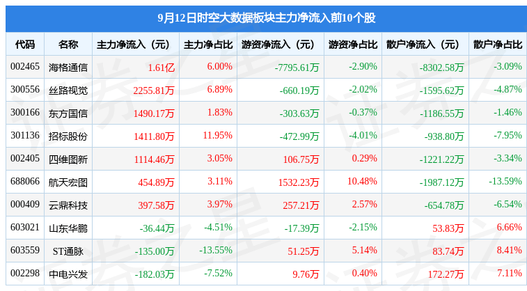 从资金流向上来看,当日时空大数据板块主力资金净流出2.05亿元,游资资金净流出7556.03万元,散户资金净流入2.81亿元。时空大数据板块个股资金流向见下表: