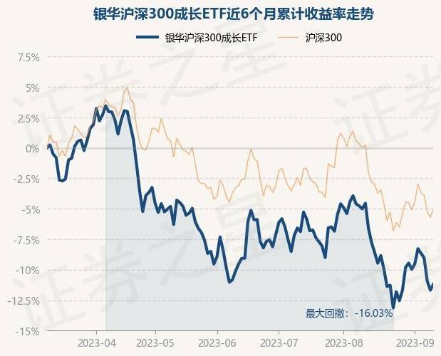 9月12日,银华沪深300成长ETF最新单位净值为0.8212元,累计净值为0.8212元,较前一交易日下跌0.21%。历史数据显示该基金近1个月下跌5.11%,近3个月下跌2.05%,近6个月下跌11.43%,近1年下跌18.1%。该基金近6个月的累计收益率走势如下图: