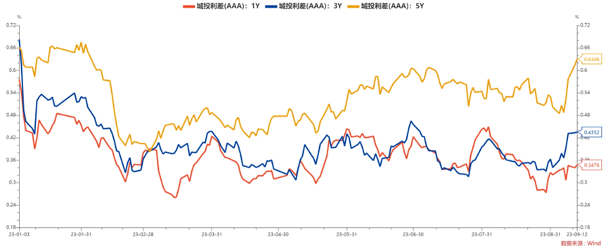 5、近期城投债(AAA)各期限利差走势及数据
