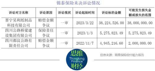 锦泰保险在偿付能力报告中公布了和公司相关的未决诉讼案件。其中一个诉讼案件的诉讼对方是四川公路桥梁建设集团有限公司,而该公司正是锦泰保险的第六大股东。