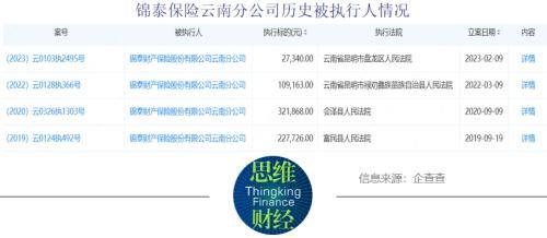 在此之前,锦泰保险云南分公司曾经分别在2019年、2020年以及2022年被法院列为被执行人。