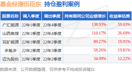 伍臣东管理的易方达中证500质量成长ETF基金在22年1季度买入山西焦煤,在持有3个季度后在22年4季度卖出。持有期间的估算收益率为26.69%,持有期间山西焦煤在2021年到2022年的年报归属净利润增幅达110.17%。