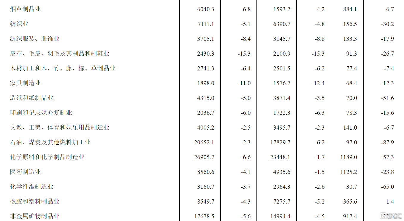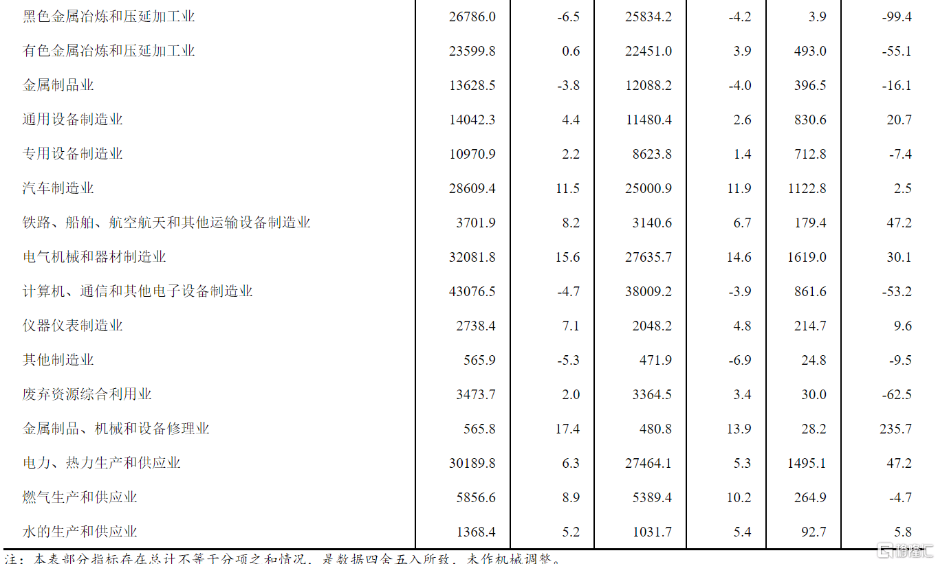 电力、热力生产和供应业利润总额同比增长47.2%,电气机械和器材制造业增长30.1%,通用设备制造业增长20.7%,汽车制造业增长2.5%,石油和天然气开采业下降6.0%,专用设备制造业下降7.4%,煤炭开采和洗选业下降14.6%,非金属矿物制品业下降27.4%,纺织业下降30.2%,农副食品加工业下降36.3%,计算机、通信和其他电子设备制造业下降53.2%,有色金属冶炼和压延加工业下降55.1%,化学原料和化学制品制造业下降57.3%,石油、煤炭及其他燃料加工业下降87.9%,黑色金属冶炼和压延加工业下降99.4%。