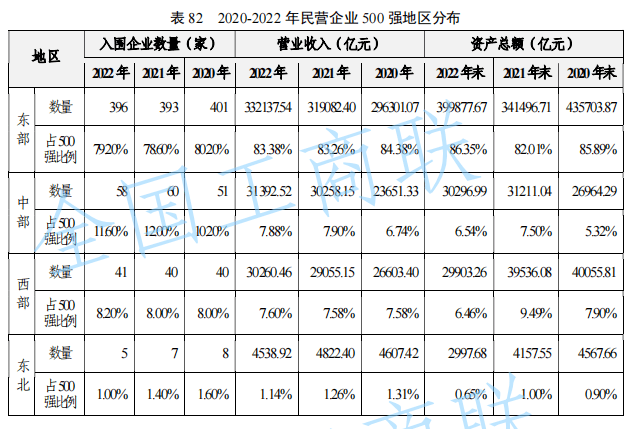 东部地区历来民营经济发达。报告显示,2022年,东部地区共有396家企业入围民企500强,占总量的79.2%。尽管数量比上年增加了3家,仍未回到2020年水平,还有“5家”缺口。