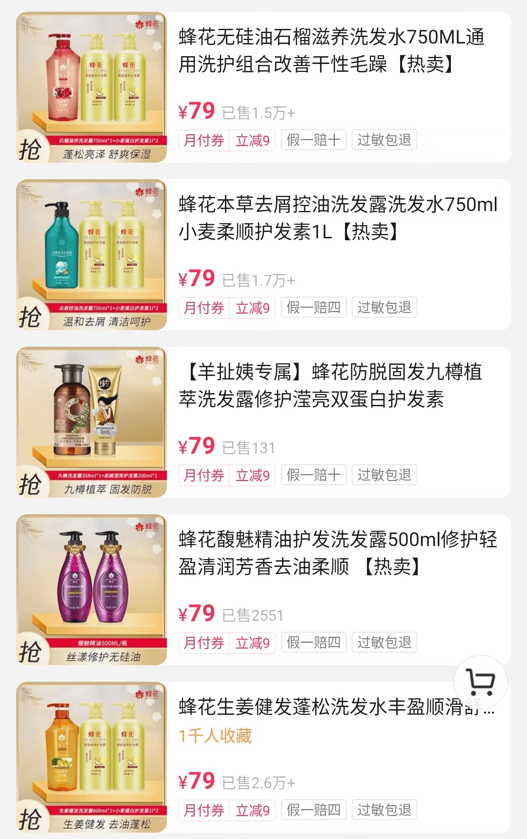 此前,蜂花也推出了79元套餐。9月11日晚,有网友发现抖音蜂花直播间主播连夜上架了79元套装。