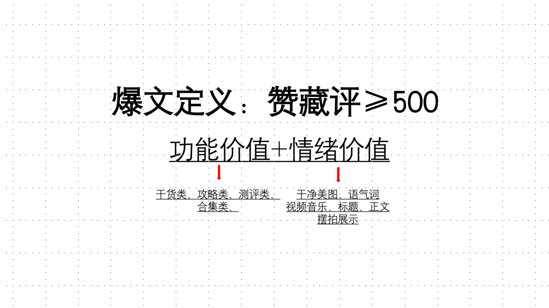 做小红书的决胜点,就是研究好如何创作出爆文?爆文的定义是赞藏评≥500,我认为爆文主要满足用户功能价值和情绪价值。