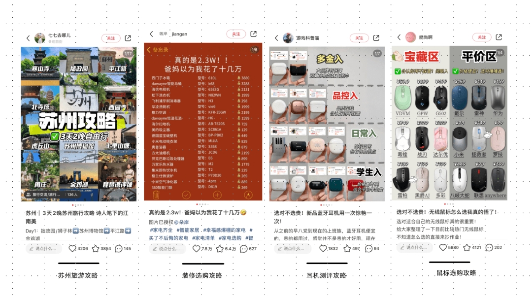 功能价值如干货类、攻略类、测评类笔记,常见如超级全的旅游干货、排行榜笔记、它解决用户选购难、如何选、怎么做的更好的问题。