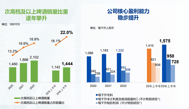 同时,今年上半年,华润啤酒的产品业结构持续优化,高端化卓有成效,其次高档及以上产品销量同比增长26.4%,每千升毛利增加11.7%,每千升税后利润(不计特别项目)增加20.0%。