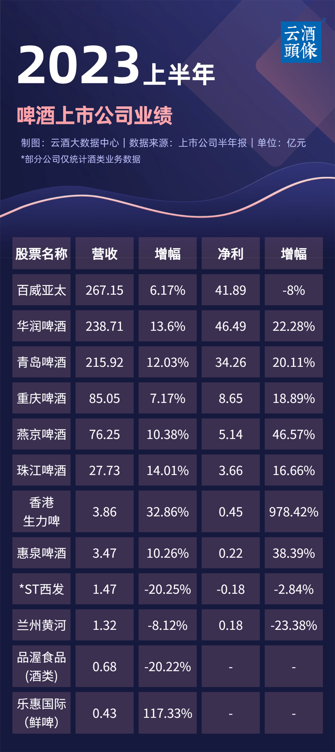 上市啤酒企业此前公布的2023半年报数据显示,百威亚太、华润啤酒、青岛啤酒、重庆啤酒、燕京啤酒等一线啤酒企业均实现营收正增长。