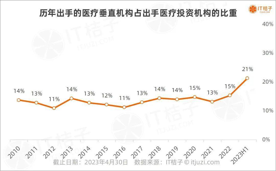 对比更广泛的投资机构群体来看,医疗垂直机构占当年市场上所有出手投资医疗的总机构数的比重平均值是 14%。2020、2022 年达到 15%,2023 年上半年的数据则增长达到了 21%——当医疗投资的泡沫过后,大量非专业机构撤退之际,专注医疗的垂直机构更多地在坚持着。