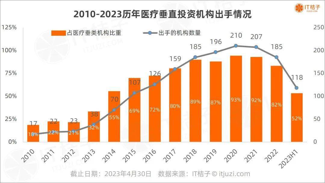 从历年医疗垂直机构出手数量来看,2010 年仅有 17 家在出手,占垂类机构整体的比重不足 1/5;之后越来越多的垂直机构出手,2015 年首次突破百家;2020 年达到了 210 家——几乎所有的医疗垂直机构都在投医疗;到 2022 年仍有 82% 的垂类机构在投资医疗;2023 上半年的数据显示,至今仍有超过一半的垂直机构活跃在医疗投资的一线。
