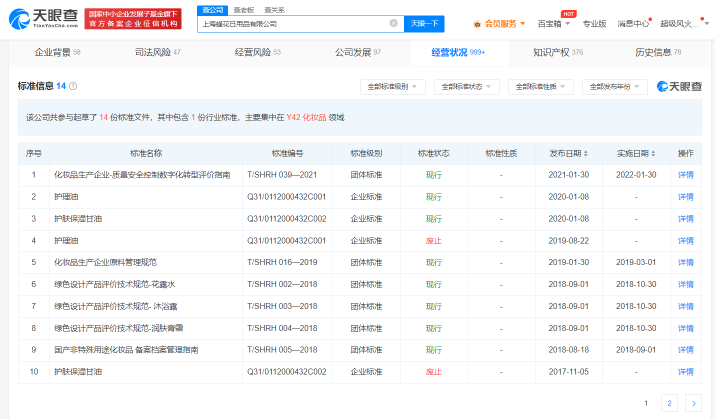 此外,经营状况信息显示,蜂花曾参与“绿色设计产品评价技术规范-花露水”“绿色设计产品评价技术规范- 沐浴露”“绿色设计产品评价技术规范-润肤膏霜”等多项团体标准的起草。