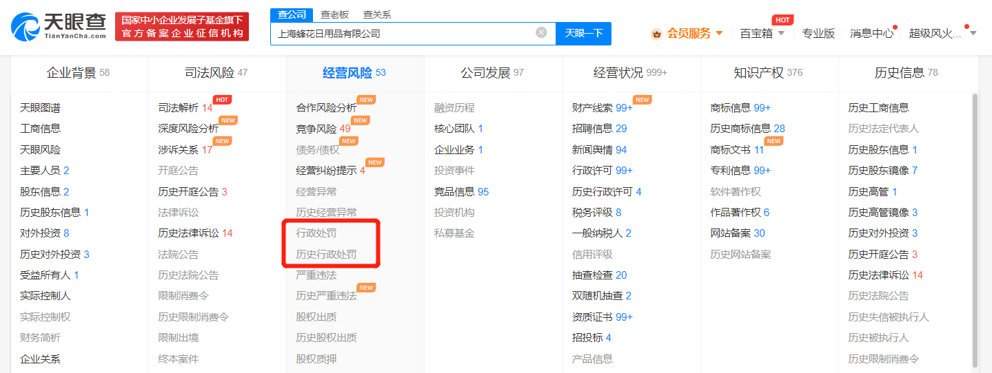 天眼查App显示,蜂花关联公司上海蜂花日用品有限公司成立于1985年8月,法定代表人为顾锦文,注册资本3280万人民币,经营范围包括开发生产及销售化妆品、化妆用品、日用品以及相关中间体、原料、包装用品,消毒剂销售等,由顾锦文与顾然峰分别持股90%、10%。风险信息显示,该公司成立38年至今,无任何行政处罚记录。