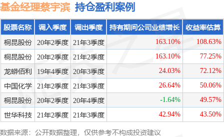 蔡宇滨管理的诺安低碳经济股票A基金在20年2季度买入桐昆股份,在持有1年又1个季度后在21年3季度卖出。持有期间的估算收益率为108.63%,持有期间桐昆股份在2020年到2021年的年报归属净利润增幅达163.1%。