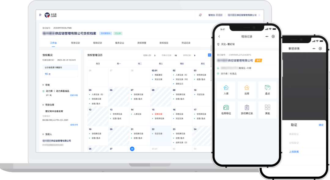 3、重视押品货权管理:在重视押品物理管理的同时更要注重押品担保物权的管理,金融机构可以结合动产自身特性及制定的监管规则为每个担保品量身定制货权管理档案,货权档案可以记录从拥有这份货权到这份货权结束全生命周期相关所有的内容,支持现场取证、多方数据采集,通过身份验证+地理位置+时间戳+视频/照片等全流程实现司法采信的存证,从而确保操作环节的真实性和准确性。
