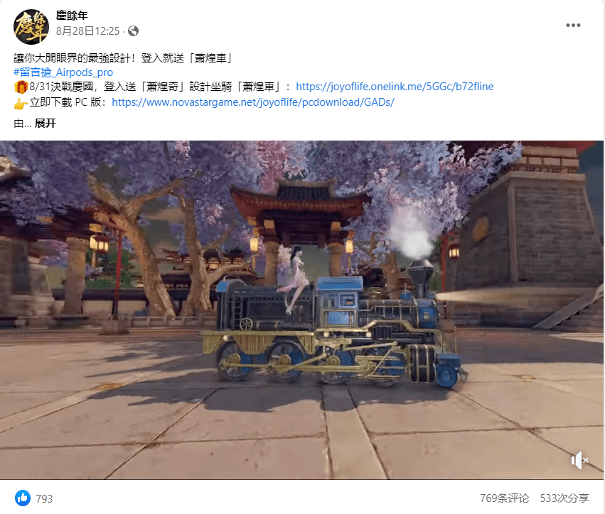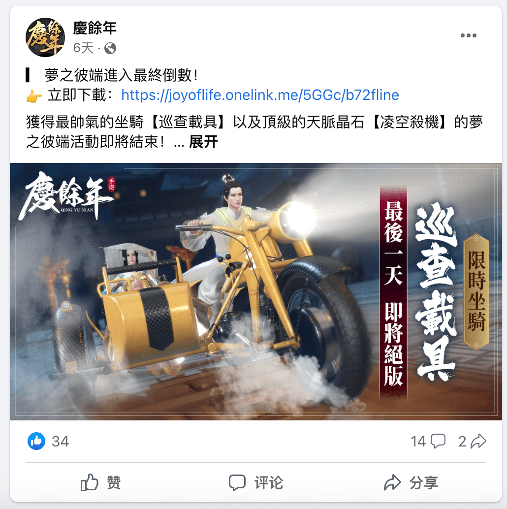 代言人/整活玩梗:代言人另辟蹊径。广州天游、露珠等出海港澳台做MMO的大户,代言人都是实力派美女明星,而星宿科技另辟蹊径与萧煌奇合作,较为特别。且萧煌奇自己在Facebook“玩梗”,丝毫不避讳,还让其亲自为游戏设计了一款专属坐骑“萧煌车”,该坐骑结合了萧煌奇畅销冠军歌曲《末班车》的概念设计而成,供玩家在游戏中免费获取。这也可以侧面看出项目组的巧思,不再一味追求“高大上”,而是希望借助代言人的效应为游戏造势。