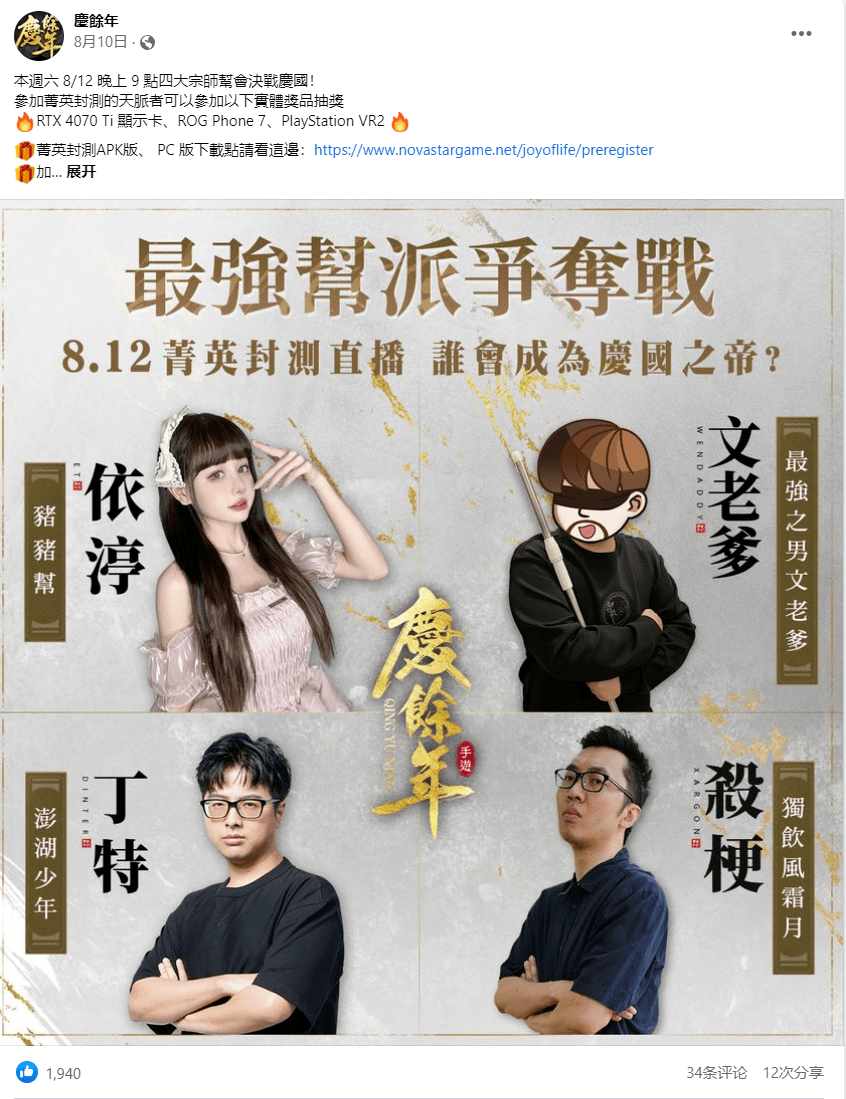 同时,我们也关注到,在Facebook的运营上,项目组对营销预热的节奏把控很有“目的性”,上线前一个月预热游戏内容、PV、门派介绍、游戏场景等,并通过“福利”、“抽奖”邀请玩家加入Discord;此后再开启“试玩”,邀请KOL开启“最强帮战”,最后公布代言人萧煌奇,整活“登录就送萧煌车”(谐音消防车),除此之外,代言人相关的内容预热都围绕“双职业”、“双武器”展开。