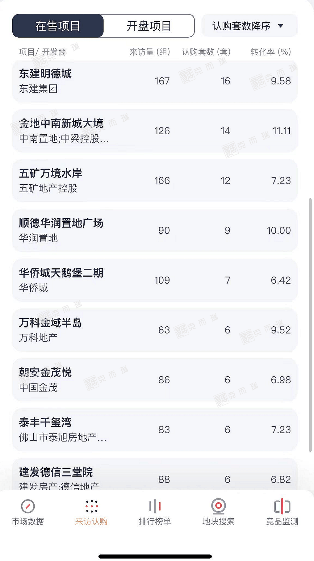 具体来看项目,以认购套数为例,第35周全市认购套数大于10套的项目共有3个,到了第36周增加至6个。
