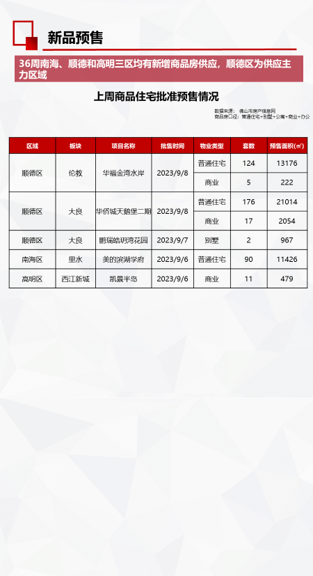 公寓:本周无新增供应。合计网签125套、0.66万㎡,环比减少84%,除高明、三水,佛山其他区均有成交。
