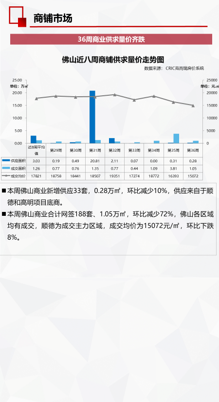 商业:商业新增供应33套,0.28万㎡,环比减少10%,供应来自于顺德和高明项目底商。合计网签188套、1.05万㎡,环比减少72%,佛山各区域均有成交,顺德为成交主力区域,